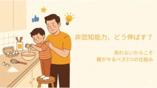 非認知能力はテストで測れないからこそ、共働き家庭の日常で伸ばせます。船津徹氏の理論をベースに、ルーティン・体験設計・声かけの3つの実践法をラボパパ家庭の具体例とともに紹介。