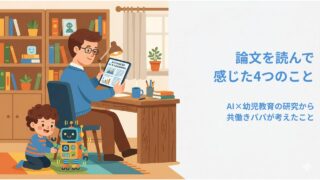 AI×子育て AI×幼児教育の論文を読んで感じた4つのこと|共働きパパの記録 AIで子ども向けアプリを作る共働きパパが、幼児教育×AIのレビュー論文を読んで感じた4つのこと。STEMへの関心や社会的スキルのポジティブな発見から、バイアス・倫理面の注意点まで。わからないからこそ論文を読む、試行錯誤の記録です。 2026.03.23 AI×子育て