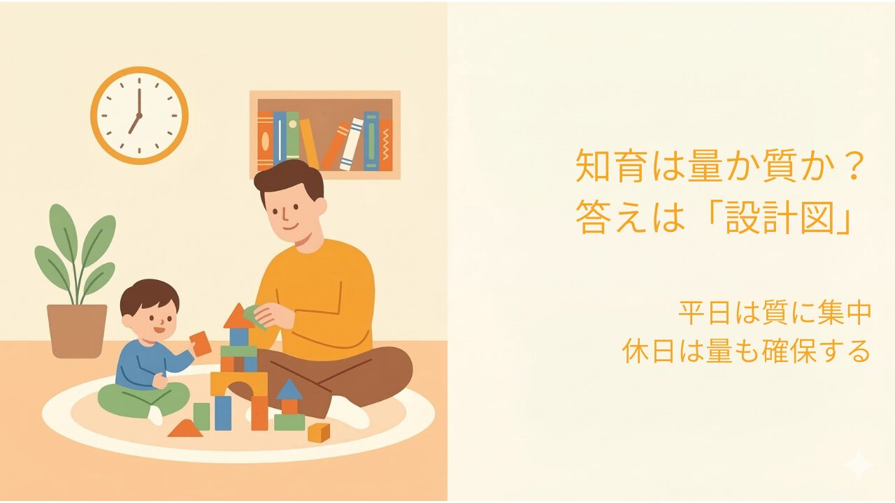 知育は量か質かという問いへの答えは、「質の高い量」を仕組みで回すこと。平日は質に集中し、休日は量も確保する。この設計図が、共働き家庭のリアルな解だと考えています。